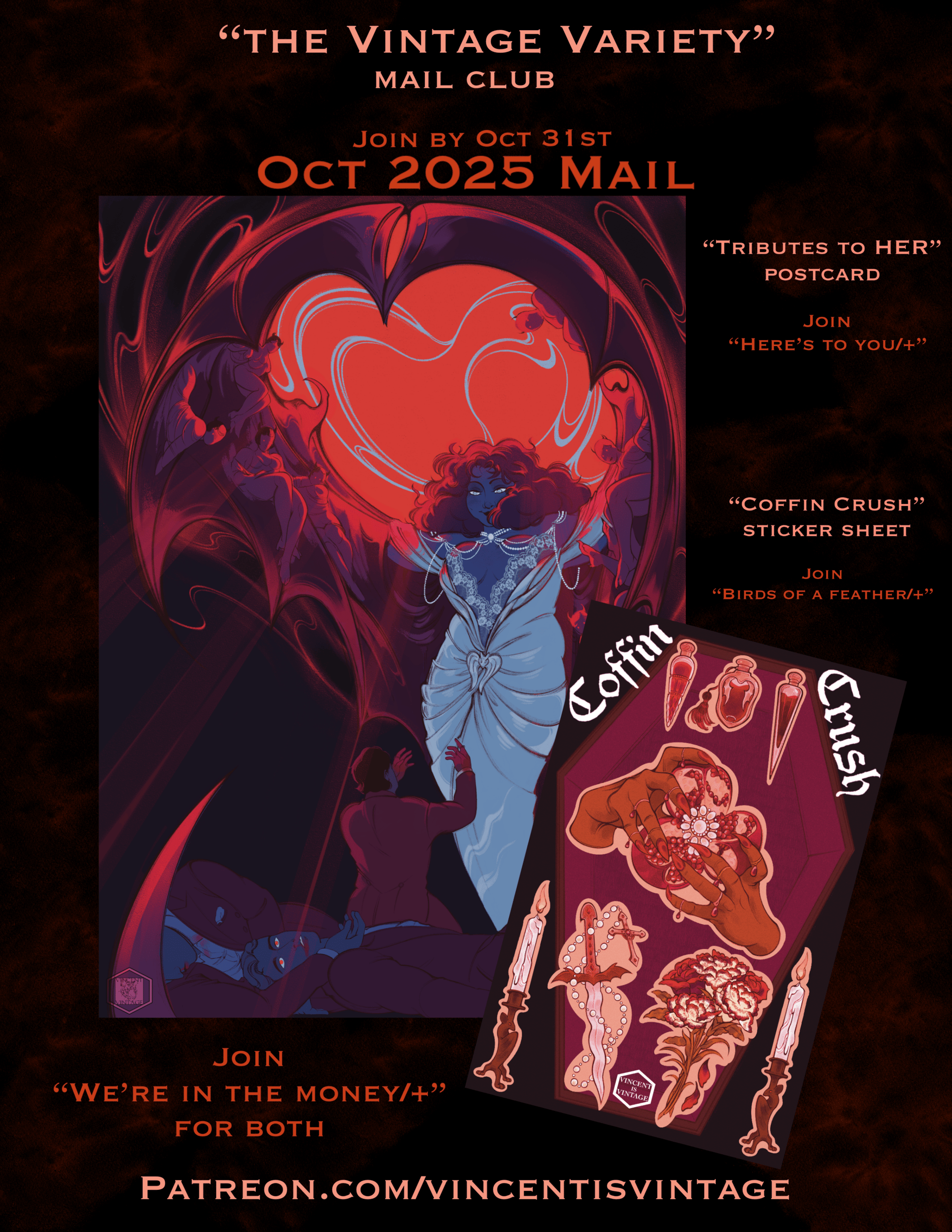 I’m utilizing the in-between time, since I send out mail every other month now, and I’m giving extra time for people to join. In the past, I’d finish the mail in time for a week-long promo push, but that’s too chaotic for everyone, so now, once I finish the art in one month and share it to Patreon first, I can promo it throughout the following month when it’s publicly revealed. So if you’d like a postcard, stickers, or both, check out the Vintage Variety Mail Club as you have til Oct 31st to join to claim your mail.