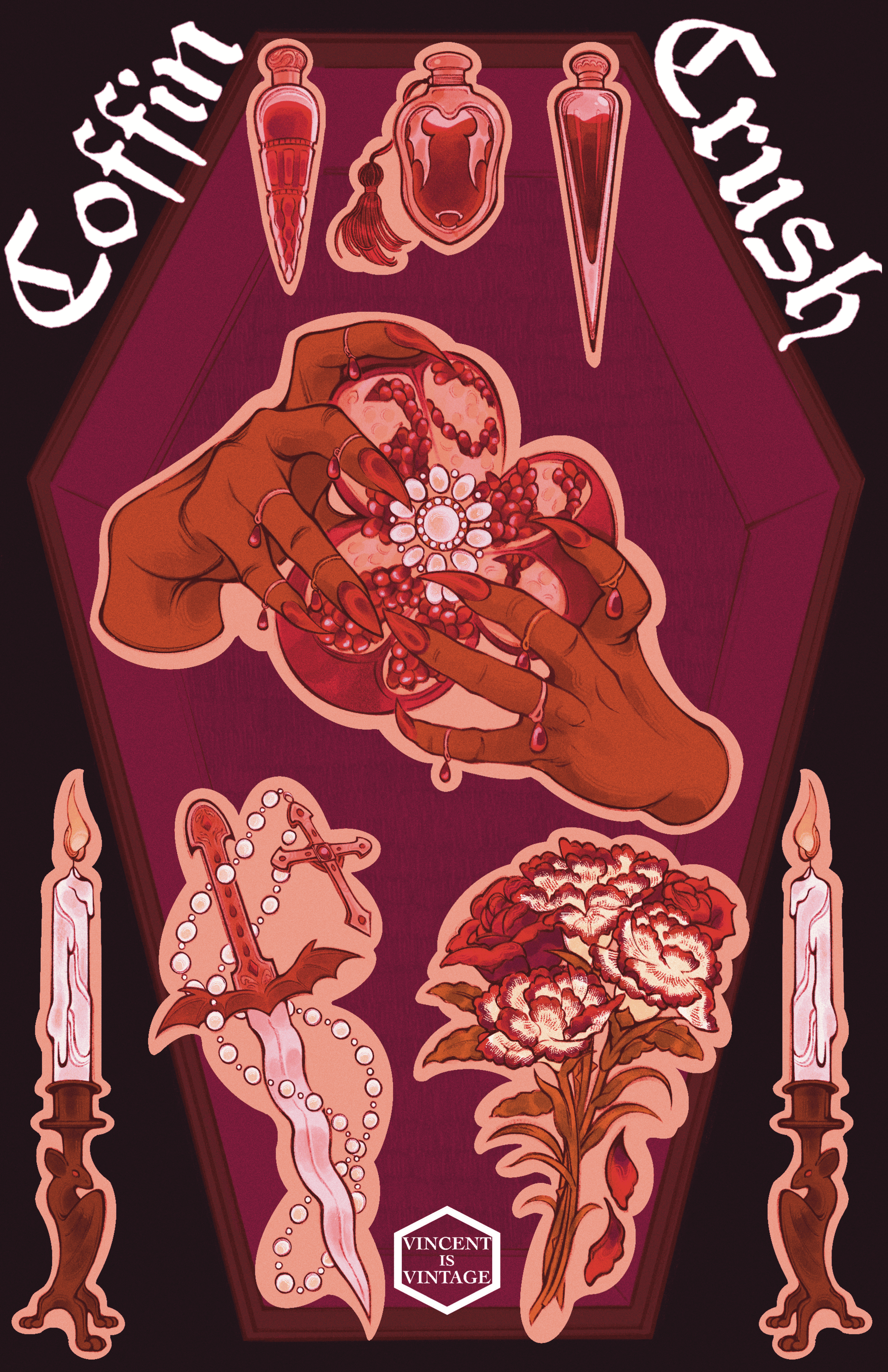 For the stickers, I wanted to make a vampire x hunter collection, thus “Coffin Crush” was born